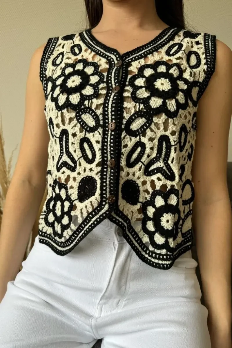 Optez pour un look bohème chic et tendance avec notre gilet crochet sans manche motif floral. Ce vêtement est idéal pour celles qui recherchent une manière originale de compléter leur garde-robe, tout en profitant de la légèreté et de la souplesse des matières.