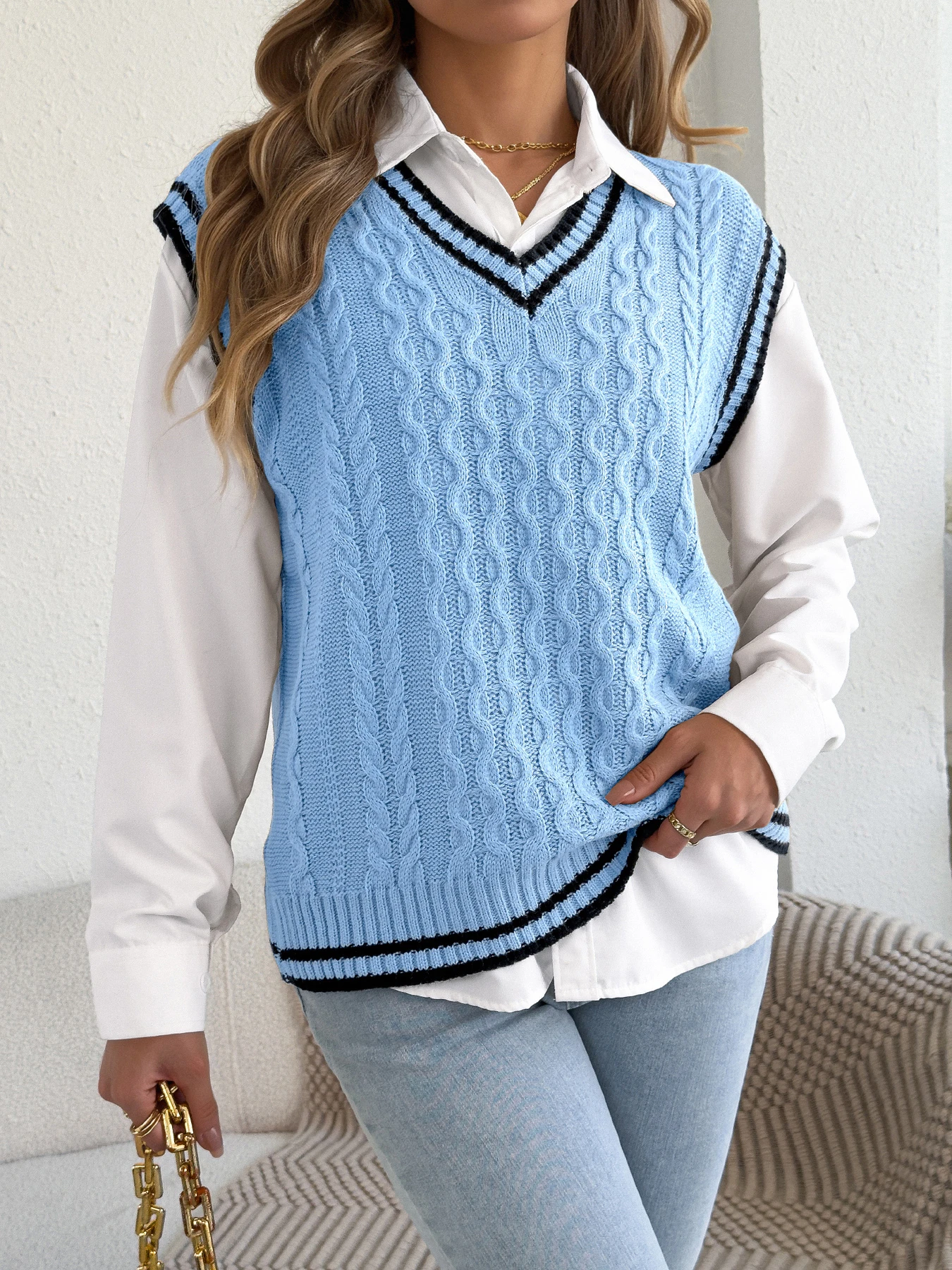 Avec sa maille torsadée délicate, ce gilet sans manche pour femmes combine style et confort. Parfait pour les journées fraîches, il enveloppe le corps de douceur tout en mettant en valeur la silhouette grâce à une coupe ajustée et tendance.