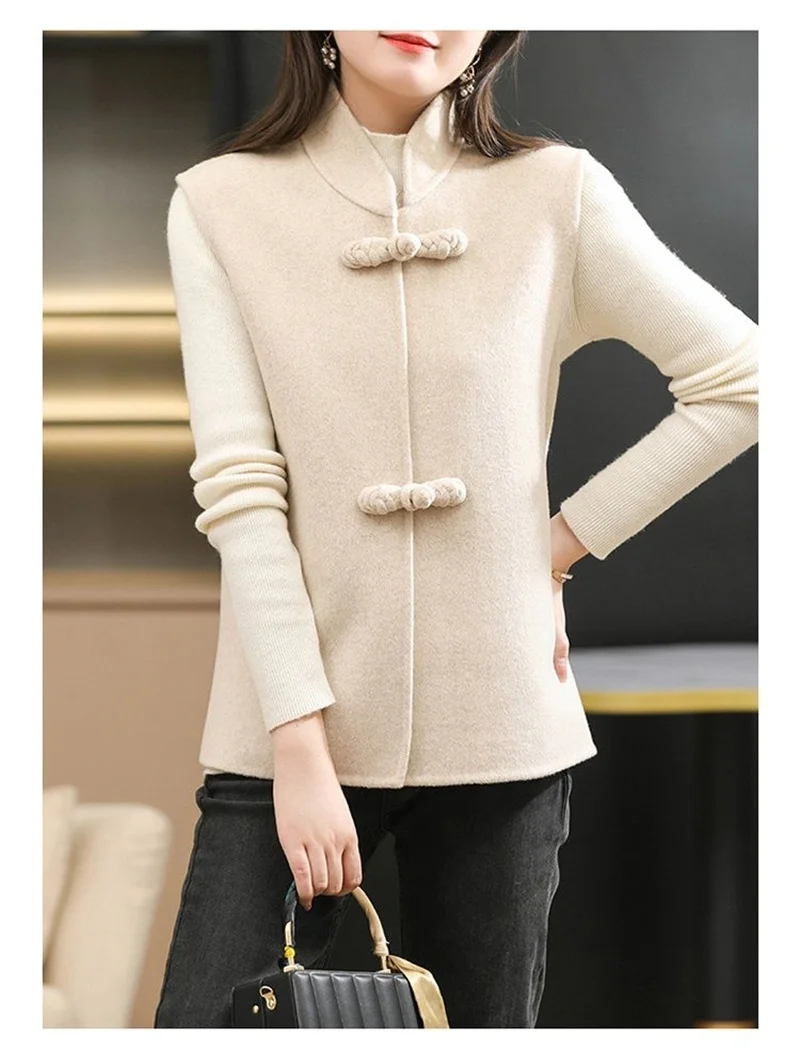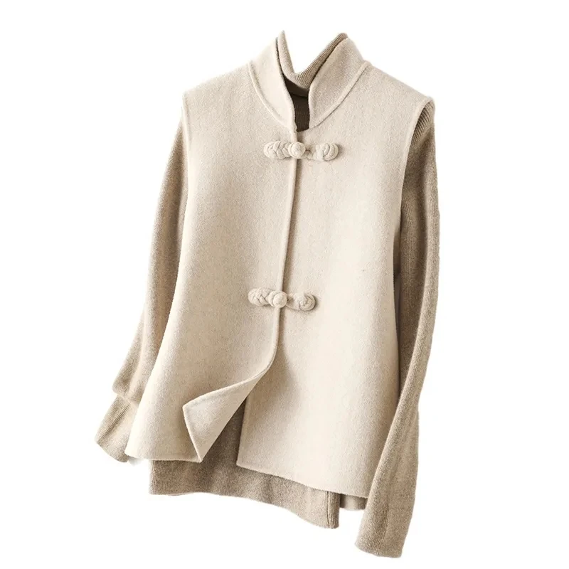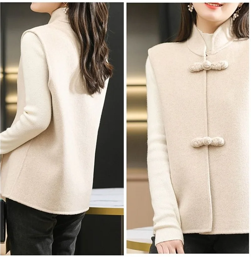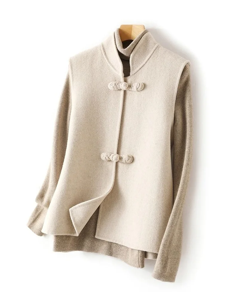 Associez le long gilet sans manche en laine pour femme col montant beige à votre garde-robe