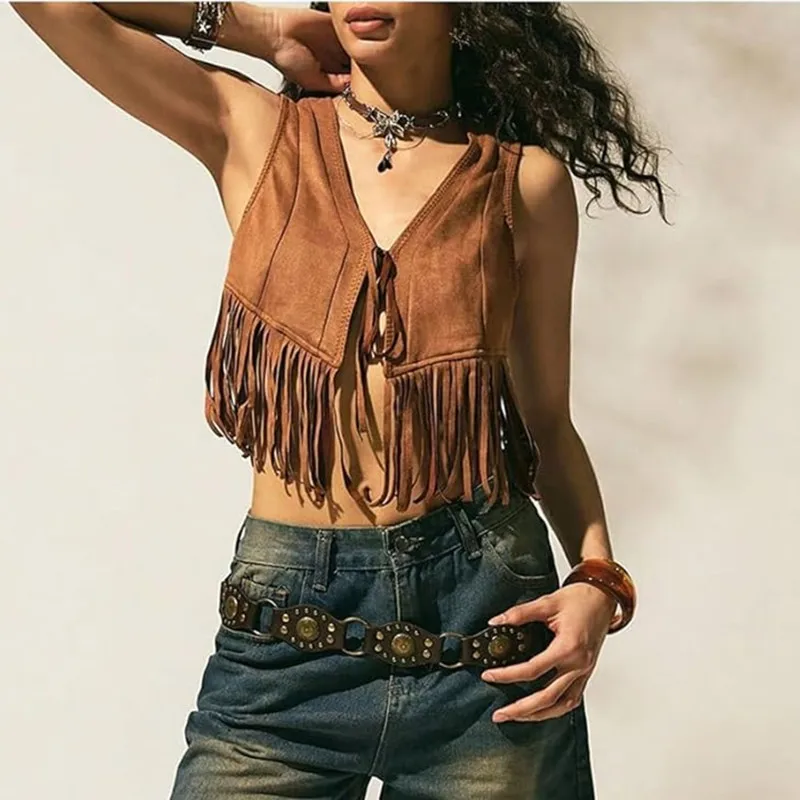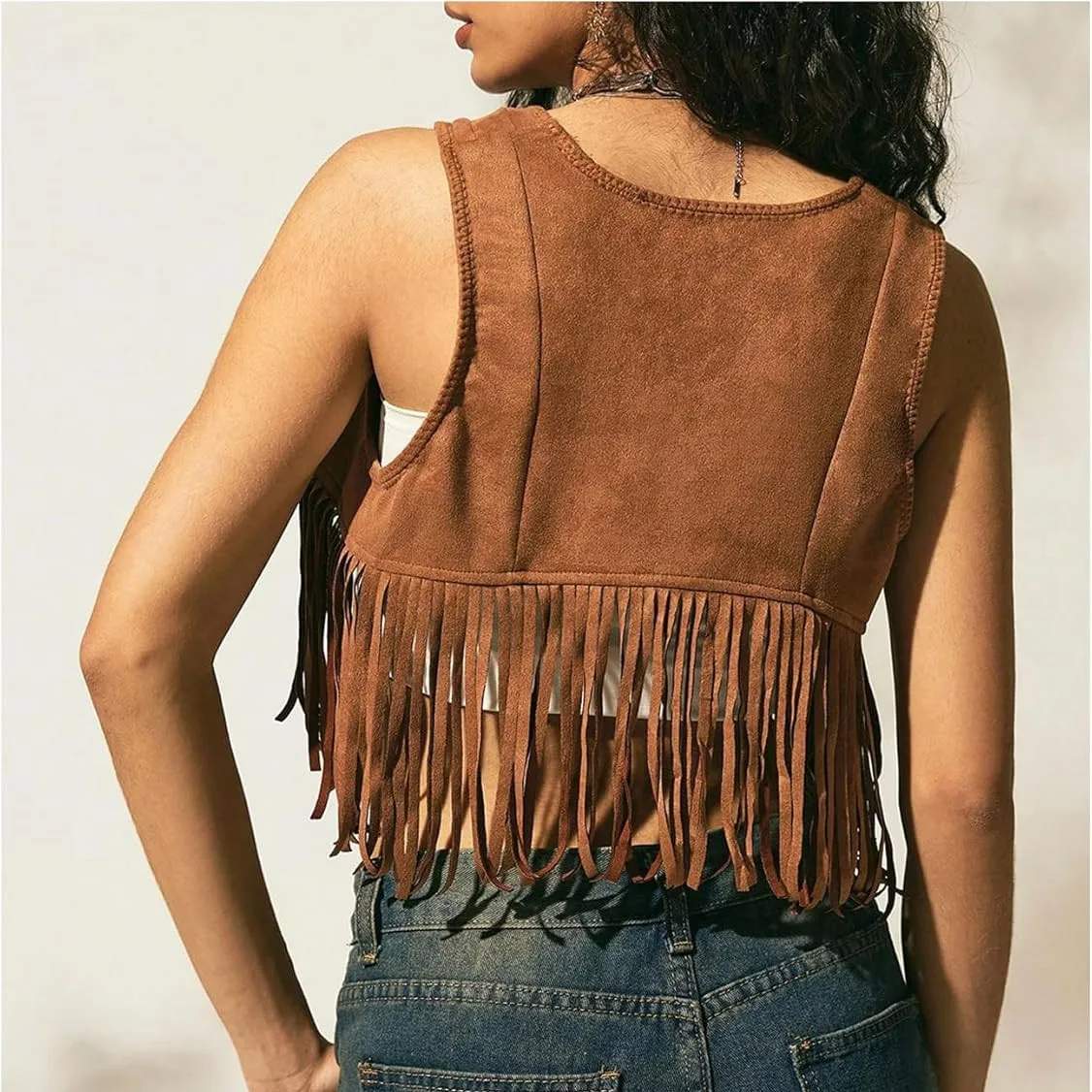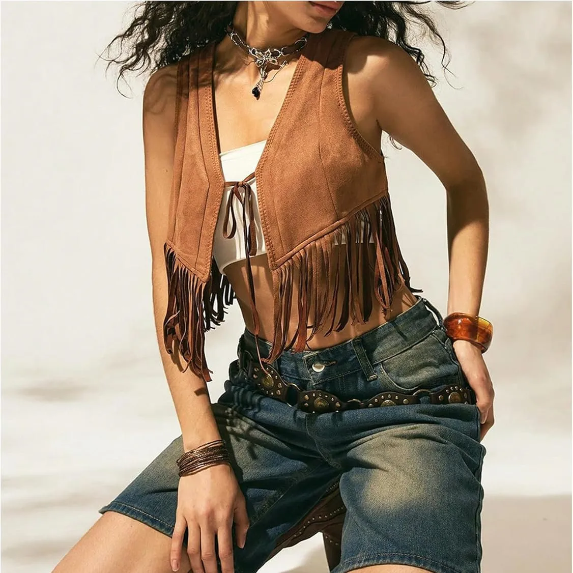 Adoptez le mini gilet sans manche marron à franges pour toutes les occasions